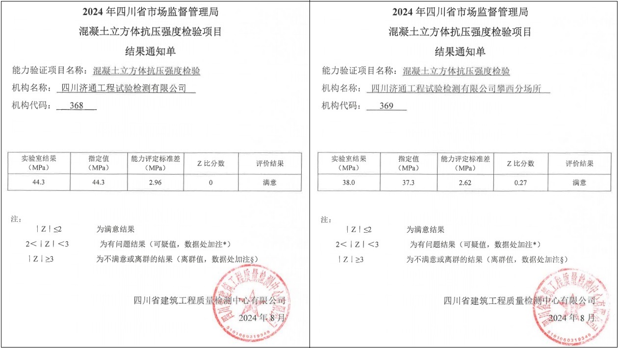 濟通檢測公司參加由四川省建筑工程質(zhì)量檢測中心有限公司組織的“混凝土立方體抗壓強度檢測能力驗證”能力考核,獲得“滿意”結果...