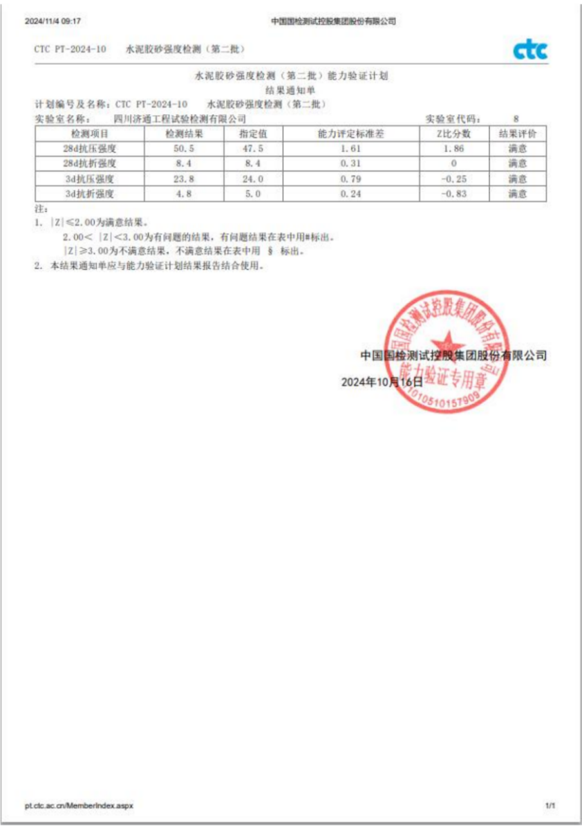 濟通檢測公司水泥膠砂強度能力驗證獲得“滿意”結果